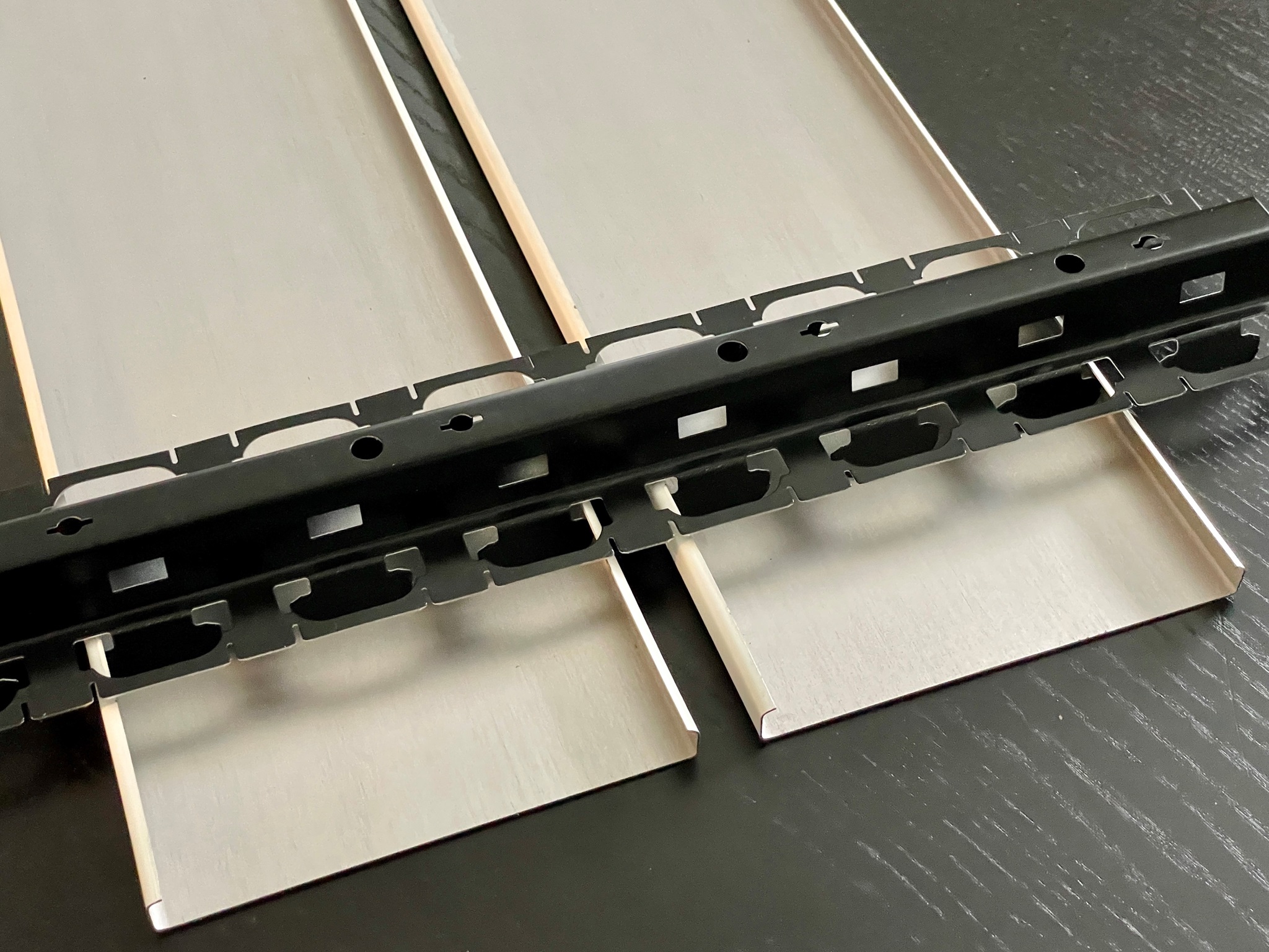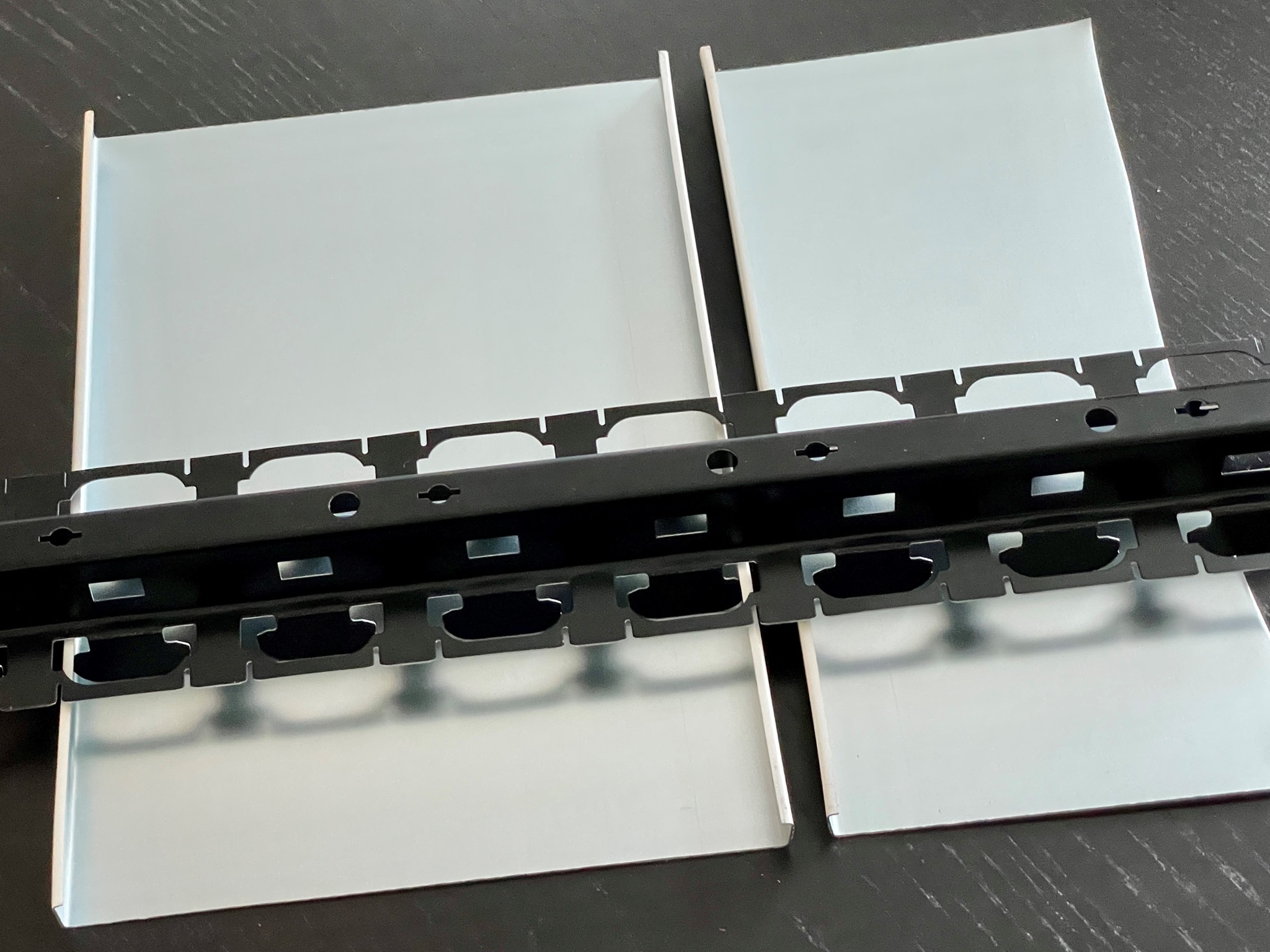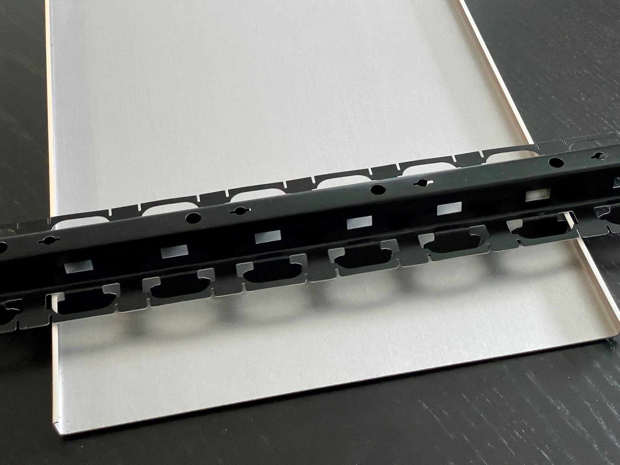 diese Tragschiene ist aus verzinktem Stahl hergestellt und beidseitig schwarz einbrennlackiert.