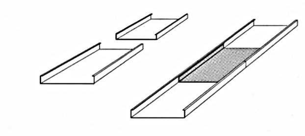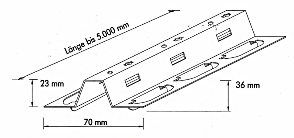 Die Längsstöße der Tragschiene werden durch einclipsen des Tragschienen-Verbinders stabil verbunden und können zusätzlich mit Schrauben oder Nieten gesichert werden.